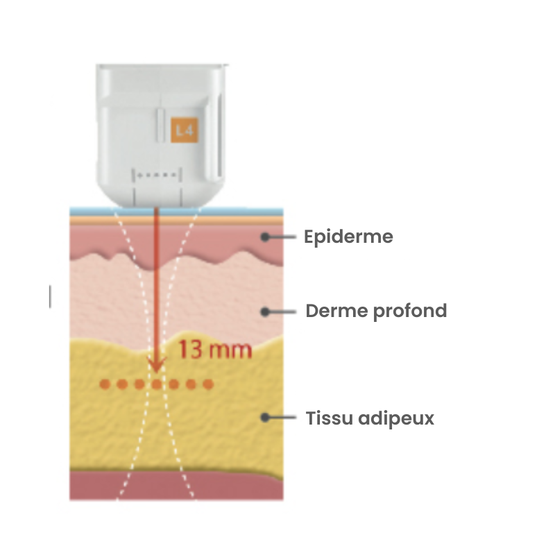 Le traitement HIFU va se concentrer avec précision sur des couches spécifiques de la peau (derme superficiel, derme profond et SMAS) ce qui engendrera des microlésions. De ces microlésions résultent une rétraction des tissus sous cutanés, une activation des mécanismes de régénération des tissus et la création d’un nouveau réseau complet de nouvelles fibres de collagène, ce qui permettra à la peau du visage et du corps de retrouver son élasticité.